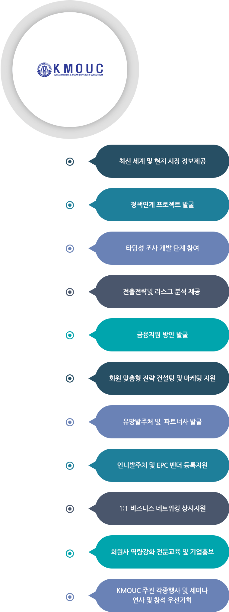 한국해양대학교협의체(KMOUC)는 2014년부터 이어온 한국과 인도네시아 양국 정부의 협력을 기반으로 해양플랫폼 해체 및 재활용, 에너지, 조선 및 해양서비스산업 분야의 핵심 전략 프로젝트 개발부터 수주까지 전방위 참여 가능한 컨소시엄 구성을 위해 회원사를 모집하고 다양한 활동을 통하여 회원사 및 학교의 이익증진에 기여하며 국내 해당산업 발전에 이바지하는 것을 목적으로 한다.